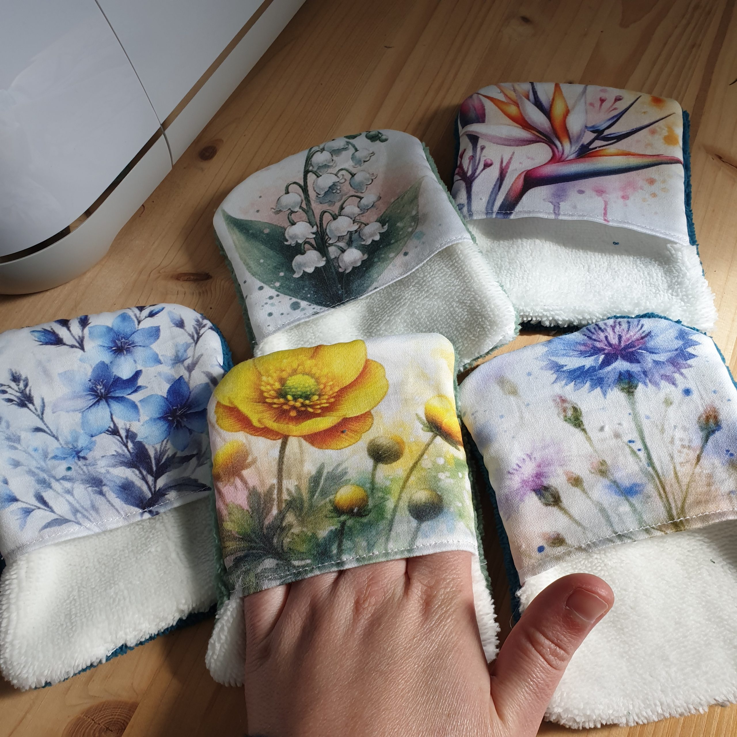 Débarbouillette ou gant de toilette taille adulte : cousu par mes soins, en coton et éponge bambou certifiés oekotex. Lavable à la machine à 30°, motif de fleur aléatoire imprimé par Cassoliv en France.