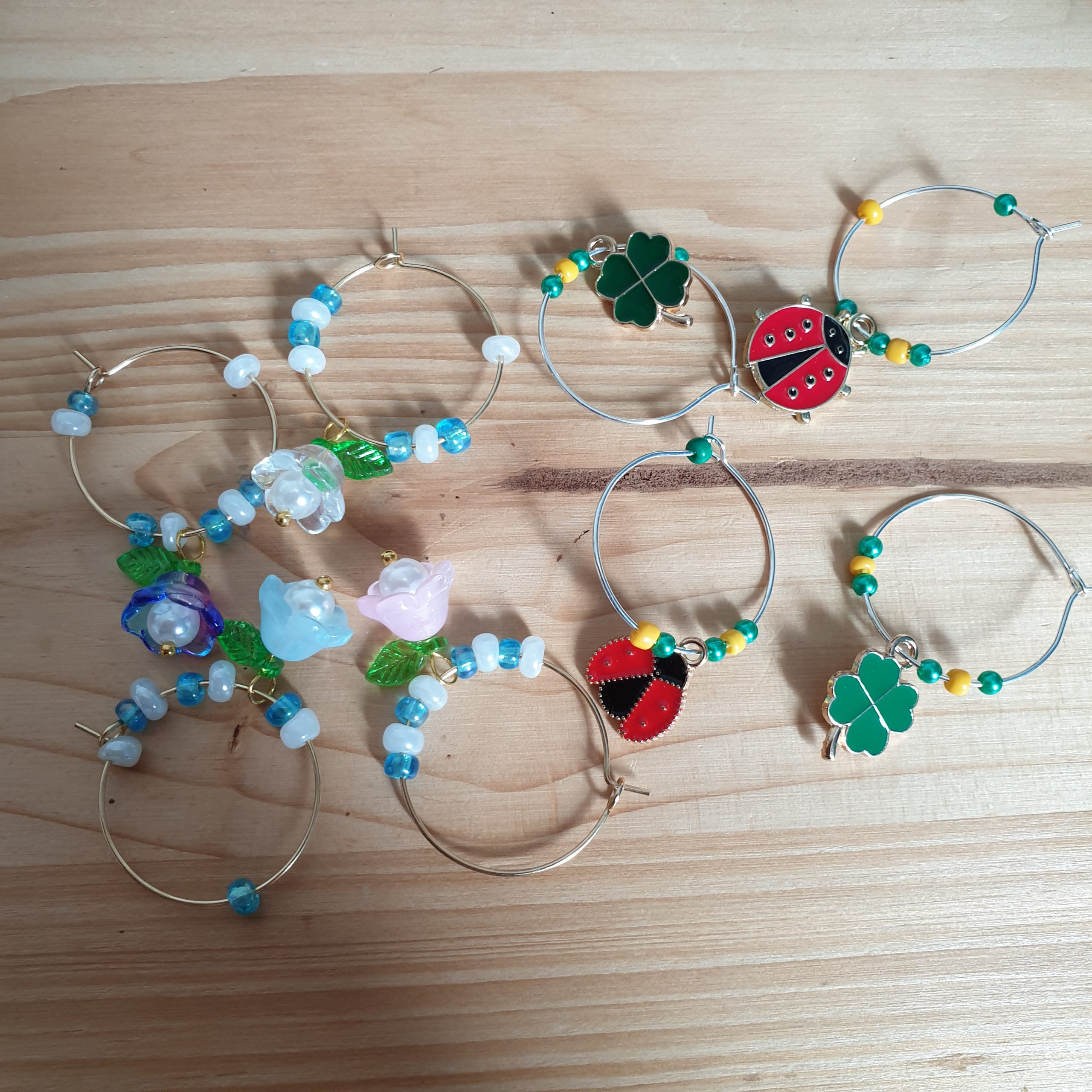 Marques-verres : à accrocher autour des tiges de verres à pied, pour ainsi décorer la table mais aussi reconnaître son verre. Anneaux et breloques de qualité, peut servir de boucles d’oreilles. Réalisés par mes soins. Toutes les combinaisons sont uniques, ensemble de 4 pièces assorties.