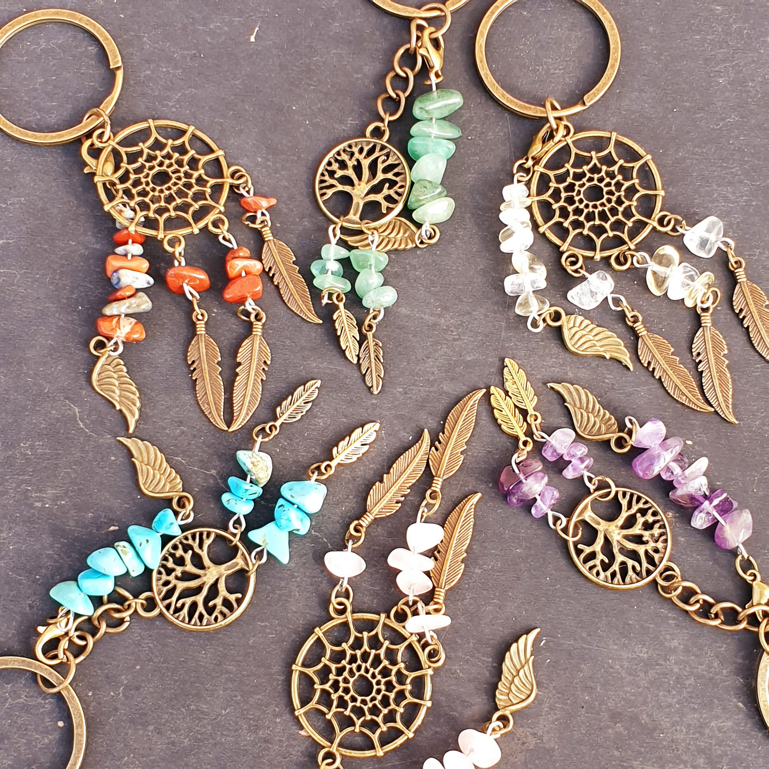 Porte-clé métal et perles de pierre couleur aléatoire, motif attrape-rêve ou arbre de vie conçu par Aurore.
